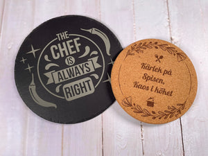 Our round trivets combine practicality with personal design – a perfect addition to your kitchen or dining table. Choose between durable natural slate (approx. 20 cm in diameter) or lightweight cork (approx. 19 cm in diameter).