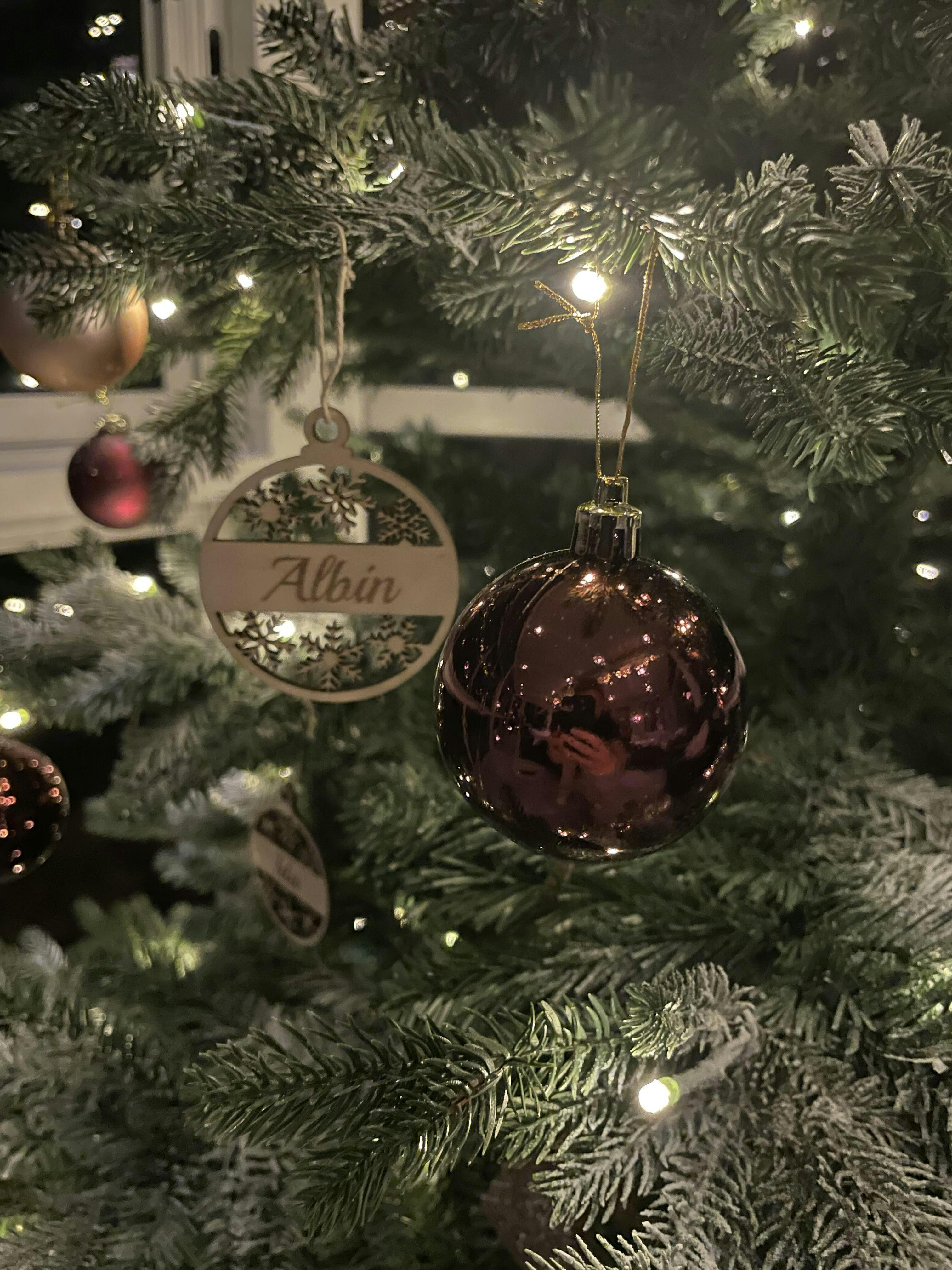 Gör julen lite mer personlig med våra trädekorationer med eget namn eller text.